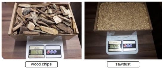A rough estimation of the amount of raw material that could be transported by a dump truck with a capacity for 100 m3 volume can be obtained by proportionality, based on the mass that could be stored in a box of know dimensions. Figure 3 presents a box with dimensions 210 mm × 141 mm × 81 mm (which results in a total volume of 0.002398 m3) over a scale. The samples were placed in the box, and the respective masses have been obtained—751 g for the wood chips and 546 g for the sawdust. By proportionality, Table 1 presents the maximum mass that could be stored in a 100 m3.