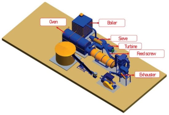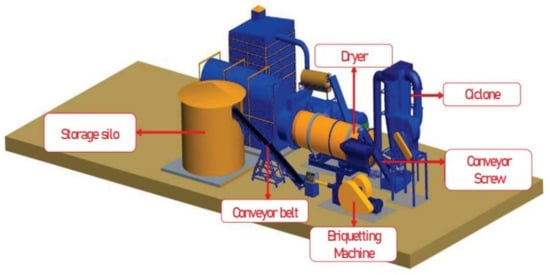 In this context, compaction begins with sieving the wood residues to remove impurities. They are transported using screws to the dryer where the moisture is removed, after drying the gases are filtered and released into the atmosphere using the cyclone and the residues are sent to the briquette machine silo where they are later compacted as briquettes and subsequently stored in the silo. Figure 4 and Figure 5 illustrate the compaction plant component location.