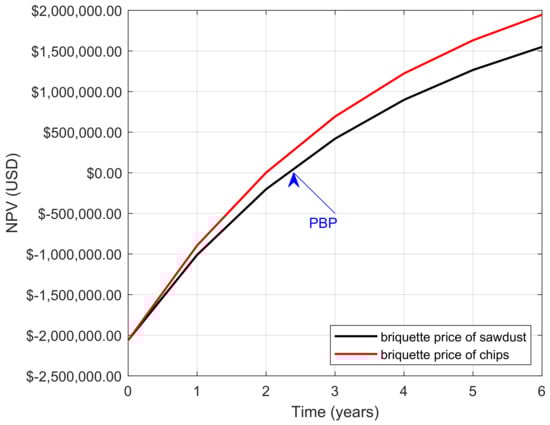 In the present work case Cb is the cost saving and Cc is the total cost per year (investment, operational and raw material costs). (Cb − Cc) is the net cash flow in the year (t), n the calculation period during the project life cycle and i is the discount rate, assumed as i = 30%. The NPV plot along 6 years is illustrated at Figure 6. It is easy to see that in both cases (briquette price assumption), the total investment costs are recovered at approximately 2–2.5 years (estimated PBP). After 6 years of project life cycle the accumulated NPV is almost equals to the initial investment cost.