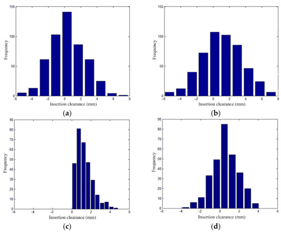 In practical engineering, the insertion clearance of block F is often not allowed to be negative, and the tolerance value is considered to be −2 mm. Therefore, the influence of the manufacturing error and positioning error in different degrees of freedom on the insertion clearance of the F block was studied. The limit case when the standard deviation of the manufacturing error and the positioning errors in the rT, rR, and rZ directions is zero was simulated separately and analyze the influencing factors. The frequency distribution of the assembly error of block F with insertion clearance under the corresponding calculation conditions is shown in Figure 24, and a summary of the statistical parameters is shown in Table 9.