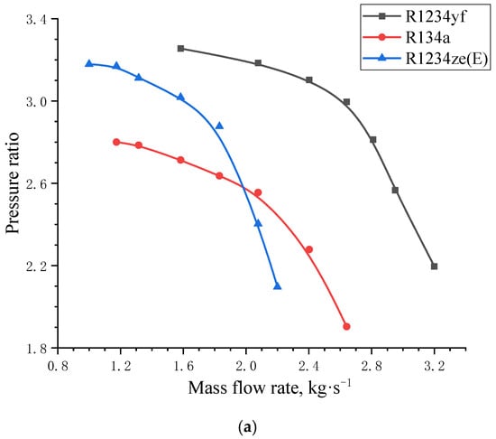 When the mass flow rate is less than 2.0 kg·s−1, the pressure ratio of the R1234ze(E) compressor is greater than that of the R134a compressor, and when the flow rate is greater than 2.0 kg·s−1, the pressure ratio of the R134a compressor is greater than that of R1234ze(E) compressor; when the flow rate is the same, the pressure ratio of the R1234yf compressor is greater than that of the R134a compressor and the R1234ze(E) compressor. Compared with R1234yf, the mass flow rate-pressure ratio performance curves of R1234zd(E) and R134a are closer.