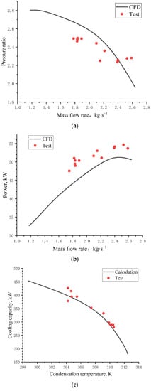 This model can run stably in the experiment of the R134a centrifugal water chiller. At the rotating speed of 21,000 r·min−1, the comparisons between the compressor pressure ratio and power calculated by the CFD method and the system cooling capacity and COP calculated by the thermodynamic analysis method and the experimental values are shown in Figure 11. It can be seen that they are relatively close, indicating that the results in this paper are reliable. The reason for the difference is that there will be some flow losses in the experiment, which are not considered in the CFD calculation.