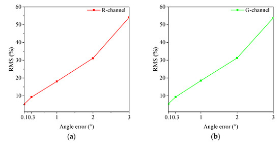 It can be seen from Figure 12 that four angular errors of 0.1°, 0.3°, 1° and 3° are added to the acquisition angle. The radiation source terms of the and channel reconstructions of the two algorithms are highly affected by the interval-angle error. In addition, the RMS rapidly increases with the increase of the angle error. When the angle error is 2°, the RMS of the regularization algorithm exceeds 30%, and the reconstruction results at this time can no longer be used to reconstruct the radiation parameters of the flame section. The impact of the LSQR algorithm is far greater than that of the regularization algorithm. More precisely, when the angle error is 0.1°, the reconstruction error of the LSQR algorithm exceeds 60%. It can be deduced from this analysis that camera acquisition angle is highly important for the two algorithms, and it is the basis for determining whether the inversion can be achieved. By analyzing the generation principle of the theoretical images, the reason why the angle error has a high influence can be determined. In fact, the flame image is a “cumulative effect” formed by a specific radiation-source item, a specific acquisition angle, a specific line of sight and a specific grid. The deviation of the angle when collecting the flame image will cause the flame images provided by multiple cameras to be contradictory, which leads to inversion errors. In contrast to the effects of the number of cameras and noise on the previously detailed two algorithms, the camera acquisition angle affects the inversion process, while its impact on the two algorithms is extremely significant.