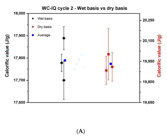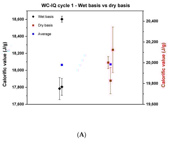 Comparison of the calorific values between the wet basis and dry basis in cycle 1. (A) describes the wood chips—industrial quality, (B) the wood chips—high quality, (C) the wood pellets.