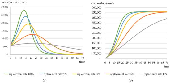 (a) Description of what is contained in the first panel; (b) Market ownership in the scenarios with 100%, 75%, 50%, 25% and 10% replacement rates.