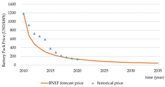 The EV industry has become part of the global transport trend. The main cost of EVs comes from battery packs. Prohibitive battery pack costs and selling prices have been the main barriers to the promotion of EVs. However, with the involvement of global enterprises in the deployment of related supply chains, the cost of a battery pack is expected to fall, which in turn will lead to a reduction in the selling price. The overall development will boost the availability of EVs. According to BNEF, in 2020, the average price of a battery pack went down to $137 per kWh. It is estimated that the price will fall to $84 per kWh in 2025, to $57.7 in 2030 and to $45.1 in 2035. By 2035, the price drop will gradually narrow to 4% from 10%. The extent of the annual price drop will be lessened year by year (Figure 3) [].