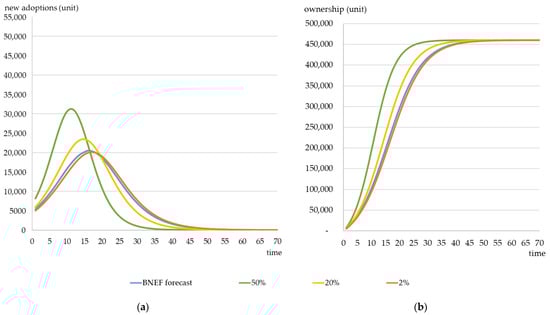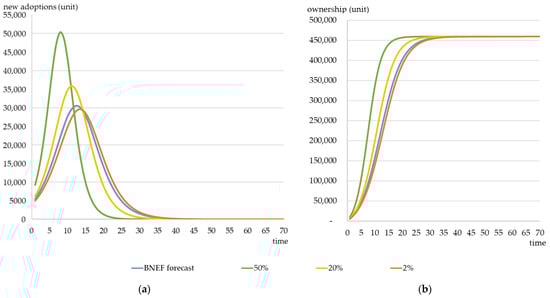 (a) In the scenario with a 100% replacement rate, the numbers of new adoptions, which are simulated in accordance with the BNEF estimation, involve annual drops of 50%, 20% and 2%; (b) In the scenario with a 100% replacement rate, the numbers for ownership, which are simulated in accordance with the BNEF estimation, involve annual drops of 50%, 20% and 2%.