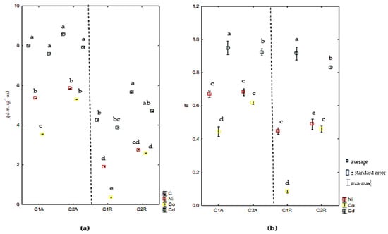 Aerial biomass and root yields of Festuca rubra in soil contaminated with heavy metals (in g d.m. kg −1 soil) (a) and the heavy metals tolerance index (TI) of Festuca rubra (b). Heavy metal doses in 1 kg d.m. soils: C—control; Ni—400 mg; Co—80 mg; Cd—8 mg; Compost: C1—soil not fertilized with compost; C2—soil fertilized with compost; A—aerial plant parts; R—roots; homogeneous groups within above-ground parts and roots are marked with identical letters (a–e).