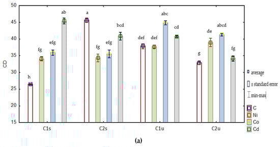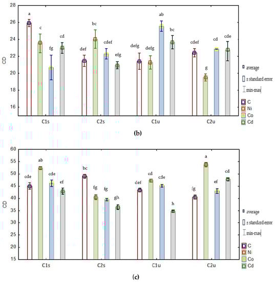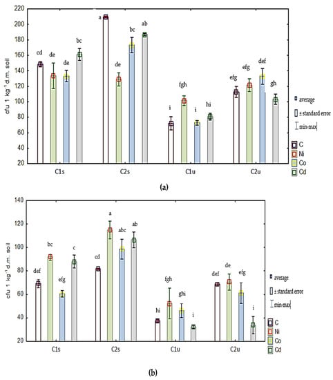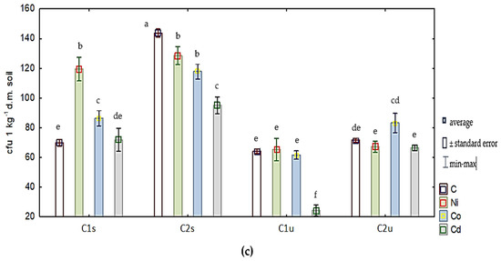 Microbial counts (CFU) in 1 kg soil d.m. (a) organotrophic bacteria 109; (b) actinobacteria 109; (c) fungi 107; heavy metal dose in 1 kg d.m. soils: C—control; Ni—400 mg; Co—80 mg; Cd—8 mg; C1s—soil not fertilized with compost, sown with Festuca rubra; C2s—soil fertilized with compost, sown with Festuca rubra; C1u—soil not fertilized with compost, not sown with Festuca rubra; C2u—soil fertilized with compost, not sown with Festuca rubra; homogeneous groups within each microbial group are marked with identical letters (a–i).