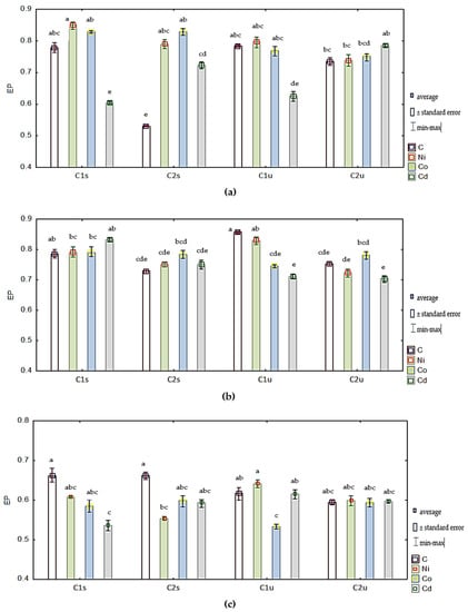 Heavy metals induced greater changes in the microbiome of soil amended with compost than in unamended soil. In this experimental series, in soil sown with Festuca rubra, nickel and cobalt significantly decreased the counts of organotrophic bacteria, and all heavy metals increased the counts of actinobacteria and reduced fungal counts. In soil not sown with Festuca rubra, the only significant changes were an increase in the counts of organotrophic bacteria under exposure to Co2+ and a decrease in the counts of actinobacteria in response to Cd2+. Heavy metals had a relatively weak impact on the ecophysiological diversity of soil microorganisms. In soil amended with compost, only nickel in the treatment sown with Festuca rubra significantly decreased the EP index of fungi (Figure 3). In all experimental series, the remaining heavy metals did not decrease the EP index.