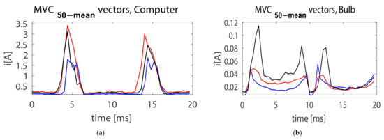 For reducing the number of attributes in vector from 5000 (the number of samples in one cycle) to 50, the mean for every 100 values was calculated, resulting in the vector. Figure 10 shows (Figure 10a) and (Figure 10b) vectors, calculated based on the data shown in Figure 9.