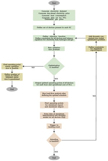 The EC model consists of three stages. The first stage is the optimization problem based on the mixed-integer linear model, which is used to determine the optimal schedule of ECs from the energy balance perspective. In the second stage, a dynamic analysis of EC island transition is conducted. If the transition was not possible, new constraints are introduced to the model to ensure the feasibility of islanding. Finally, the third stage updates the first stage with constraints obtained from the second stage, providing an optimal schedule of ECs while ensuring islanding capabilities. The proposed framework is shown in Figure 2.