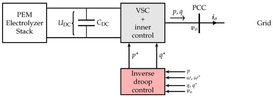 Dynamic model of PEM electrolyser system: PEM Electrolyzer Stack [,,], Inverse droop control [,].