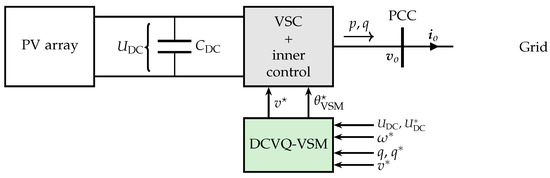 The PV system (Figure 5) is operated in MPPT mode, so the control system of the PV converter is based on the DCVQ-VSM where the DC link voltage and reactive power are controlled. The reactive power control is achieved by setting the reference values (,) as in PQ-VSM. The DC-link voltage controller provides the frequency reference value and achieves active power synchronization utilizing the dynamics of the DC-link capacitor to achieve the inertial response (albeit small due to the negligible amount of stored energy in the PV system). The DC-link voltage is a function of power flow through the DC-link capacitor and its capacity as given by (40):