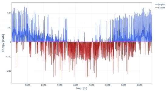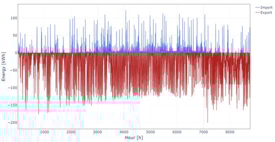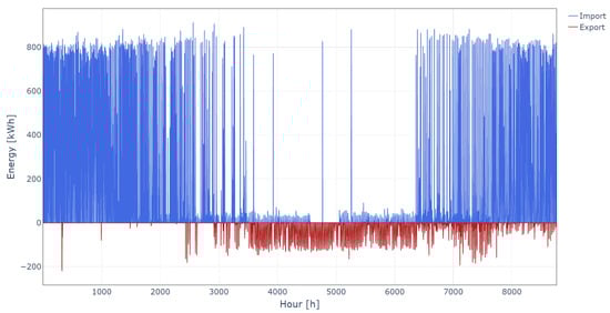 The annual operational cost of the fully electrified EC is EUR 7966. Figure 6 shows electricity exchange with the market for the whole year on an hourly basis. During the winter period when heating consumption is high and PV production is generally lower, EC buys large amounts of electricity. On the contrary, during summer months, there is no heating production and PV production is higher, and thus EC mostly sells electricity. The case of maximum export happened in hour 5267 when all PV units generate 4.2 kW and all BESSs are discharged with 4.5 kW. There is no HP consumption, and the total load is 2.3 kW. This leads to a total export of 257.7 kW. In the case of the maximum import, there is no PV production and all BESSs are charged with 5.0 kW. The HP consumption amounts to 94.9 kW, while the total load is 1.4 kW. This leads to the total import of 246.3 kW in hour 796.