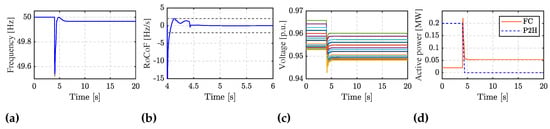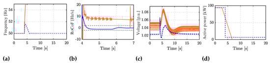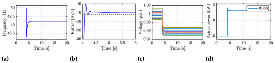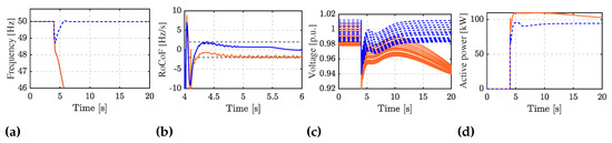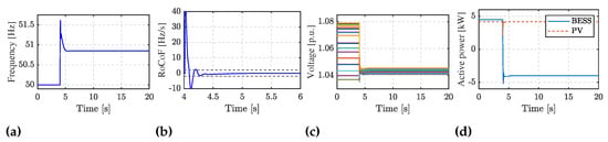 where is the grid frequency reference; is the measured DC-link voltage; is the reference value of the DC-link voltage; is the DC-link voltage tracking coefficient; is the damping coefficient; is the inertia emulation coefficient []. The internal converter angle is the same as in (28). This control strategy enables the provision of inertial response and damping effect, yet the power–frequency droop control cannot be achieved, and therefore the PV unit cannot contribute to the steady-state frequency value. The detailed model of the implemented PV system can be found in [].