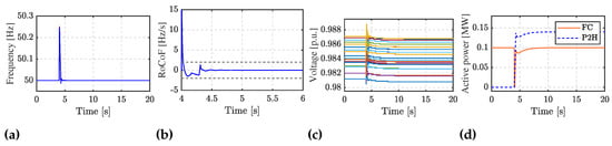 The network model is based on a real three-phase low-voltage distribution feeder of Zagreb, Croatia. Residential loads are modeled as constant impedance loads. CIG takes full advantage of available grid-forming schemes as RES should provide voltage and frequency references during islanded operation of EC. Since the grid-forming capability depends on the available energy on the DC side, appropriate control schemes are chosen for each device; CIG with a sufficient amount of energy at the DC side (FC, BESS) is controlled as PQ-VSM, while sources with a negligible amount of energy (PV) are controlled as DCVQ-VSM. VSM technologies emulate the static and dynamic performance of synchronous machines, i.e., their inertia and damping effect. Therefore, their implementation is based on some form of the swing equation, assuming the presence of the virtual rotor and virtual governor. Converter-interfaced loads (electrolyzer) are grid-following operating in grid-supporting mode, which means they can adjust their output active and reactive power according to frequency and voltage changes, respectively. All grid-side converters are voltage source converters (VSCs). The design of inner voltage and current control loops is not described in detail, for which we refer the reader to [].