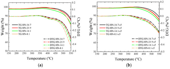 The weight loss of NMG is greater than that of the HN samples. Compared with anthracite, the chemical structures of bituminous coal have a higher degree of disorder, more bridge bonds, and more functional groups, resulting in a more active chemical reactivity. It is worth noting that the mass loss of NMG–gy5 and HN–gy5 is smaller than that of NMG–s5 and HN–s5, respectively. The reasons for this will be outlined later in this paper.