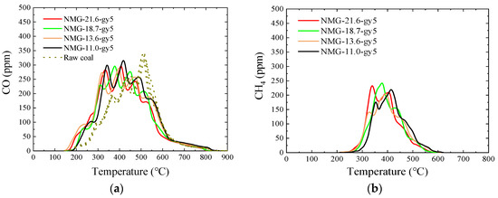 Pyrolysis gas formation curves of NMG–gy5 are demonstrated in Figure 9. The amount of gas production is integrated for a further analysis. Due to the emergence of new peaks, the generation curves of raw samples have been added in Figure 9a,f for comparison. Compared with the raw samples, the overall CO formation temperature of the NMG–gy5 samples is lower. Additionally, the generation amount increases between 5.12 and 15.50%. After peracetic acid modification, carboxyl functional groups are introduced. These structures will decompose into CO, CO2, and H2O when over 200 °C [32]. Hence, the initial releasing temperature of CO is lowered. As shown in Figure 9g, the release of CO2 is also clearly detected in NMG–gy5 groups due to the introduction of carboxyl groups [11], while there is no explicit CO2 signal in raw samples. Former investigations prove that CO2 derives from the decomposition of carboxyl groups and carboxylic acid at low temperatures and is related to the thermal decomposition of ethers, quinones, and O-containing heterocycles at high temperatures [36]. In addition, the position of the carboxyl group in the coal matrix and the surrounding functional groups can determine the integral thermal stability [6], which explains the overall CO generation curve moving to the low temperature section. Additionally, all the temperatures of the CO releasing peaks reduced by about 50 °C.