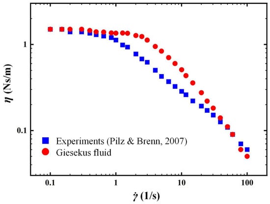 Table 1 shows the physical and rheological properties of the continuous phase, the experimental data is cited from Pilz and Brenn []. A 0.8 wt% Polyacrylamide(PAA) solution is used. Due to the shear thinning effect of the solution, the Giesekus model is studied caused of the rheological properties of the continuous phase. Migration factor α is achieved by fitting the formula between the relaxation time λ used by Pilz and Brenn [] and the zero shear viscosity value. The variation of shear viscosity with the shear rate for the Giesekus model can be obtained according to Equations (18) and (19), as shown in Figure 2. The error is similar to that in the work of Yuan et al. [] and the effect on the results can be neglected.