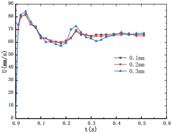 Three grid sizes of 0.1 mm, 0.2 mm, and 0.3 mm are selected for the independence test. Taking the rise of bubbles with a diameter of 6 mm as an example, Figure 3 shows the bubble velocity calculated by three kinds of grid computing. It can be seen from Figure 3 that the velocity is fluctuating. When the bubble movement tends to be stable, the difference between grids of 0.1 mm and 0.2 mm can be ignored. However, the error of grid computing with a size of 0.3 mm is relatively large. Taking into account the calculation duration and the accuracy of simulation results, finally, a grid size of 0.2 mm is selected.