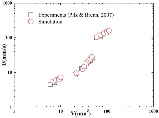 As we know, the most reliable way to verify the accuracy of the simulation method is to compare the experimental data with the results obtained from the simulation. However, experimental studies on the motion of parallel double and multiple bubbles in viscoelastic fluids have not been reported in the open literature. Therefore, this study presents a comparison between the experimental results of a stable rising single bubble in viscoelastic fluids with the simulation results. Figure 4 shows the functional relationship between the terminal velocity of a single bubble and the volume of a bubble in a 0.8 wt% PAA non-Newtonian liquid. It is observed that the numerical simulation results are in good agreement with the experimental results of Pilz and Brenn [], both of which exhibit velocity jumps [,].