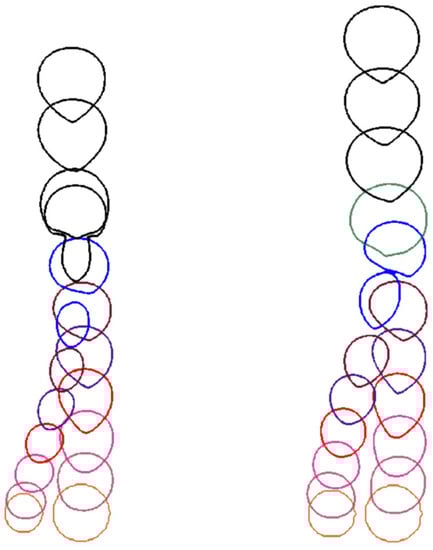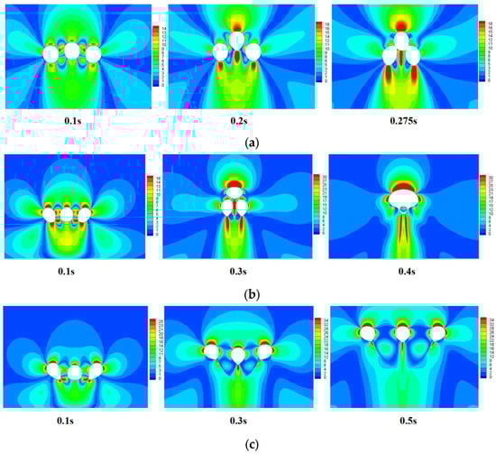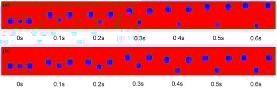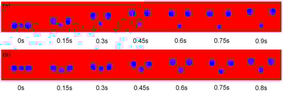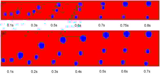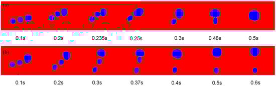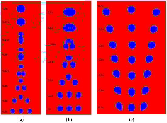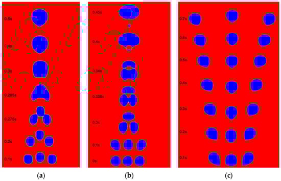 Figure 8 shows the motion trajectory of bubbles with diameters of 4 mm, 5 mm, and 6 mm and spacing of 1 mm. In Figure 8a, three bubbles come into contact and coalesce with each other simultaneously. At the initial moment, when the bubble of 4 mm rises, under the action of shear thinning, the viscosity around the middle bubble is decreased, as shown in Figure 9. The motion speed increases and the velocity gradient difference formed between the bubbles cause the bubbles on both sides to be attracted until direct contact. When t = 0.275 s, the bubbles at both ends move toward the middle bubble and contact with each other. From Figure 10a, it can be seen that the vortices of the two below bubbles act on the upper sides of the two bubbles, respectively, converging on both sides below the middle bubble. The middle bubble interacts with the two bubbles to form two steam bridges []. The curvature of the gas bridge is small, and under the action of surface tension, the merged bubbles can still stretch longitudinally, which is attributed to differences in bubble size and rheological property.
