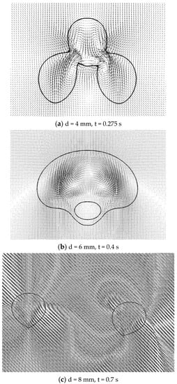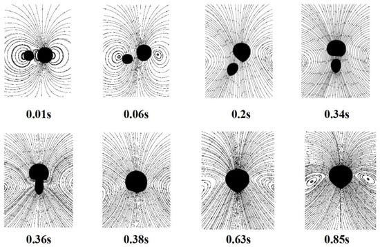 We can see the rising process of bubbles of d2 = 5 mm is similar to that of the bubble of d2 = 4 mm. The difference is that a small bubble gets coalescence before reaching the bottom of the large bubble. It can be explained that the bubble with a diameter of 5 mm has a larger volume, which is easily captured by the rising wake of the large bubble. In addition, the shear thinning effect accelerates the small bubble to catch up with the large bubble. As can be seen from the flow field diagram in Figure 7, the streamline at the bottom left region of the large bubble is denser than that of the bottom right region. Since the small bubble pushes the liquid upwards, the viscoelastic stress and thrust of the bubble act intensively on the bottom left side, leading to the early coalescence of the two bubbles. According to the experiments of Li and Gupta [] and Stewart [], it is concluded that the coalescence between bubbles occurs while one bubble is captured by the wake of another bubble.