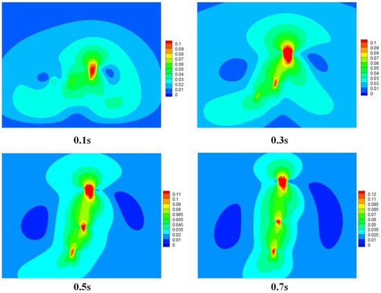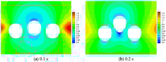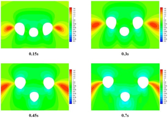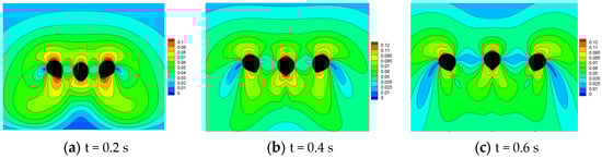 Figure 15 shows the motion state of the three bubbles rising freely when the bubble size remains unchanged and the spacing between the bubbles is enlarged. The phenomenon in Figure 14a is consistent with that in Figure 13b, and the principle of interaction between bubbles is basically identical. When the diameter of the right bubble increases to 6 mm, the motion state of the bubble will be changed clearly. Figure 16 shows the cloud diagram of the velocity of bubbles and surrounding liquid during the rising process. When t = 0.1 s, the velocity of the right bubble is much higher than that of other bubbles, and the surrounding fluid flow drives the middle bubble to move toward the direction of the large bubble. As the bubbles continue to rise, the movement of the large bubbles above gradually stabilizes, and the shape of the bubbles is an inverted teardrop. When t = 0.7 s, the interaction between bubbles gradually decreases, and the rise of bubbles has a significant impact on the flow of surrounding fluid, and bubbles cannot coalesce. Here, we predict that the two bubbles below will merge at some point. This is because after the stable rise of a large bubble, a negative wake will be generated at the lower end of the bubble, which will hinder the rise of the middle bubble. When the two bubbles are close together, under the action of shear thinning, the lower bubble accelerates to catch up with the middle bubble. Under the influence of inertia, viscoelastic stress, and other factors, the two bubbles will converge at a certain time.