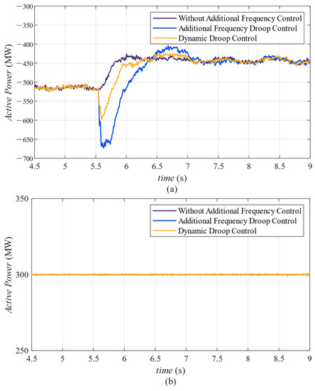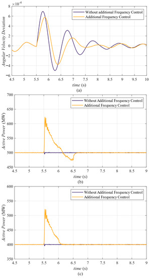 In the initial system state, the primary control and auxiliary control lines were selected as previously described. The active power of line two, line three and line four was controlled at levels of 300 MW, 300 MW and 500 MW respectively, through the IPFC. The IPFC installed on line three and line four applied additional frequency droop control with a fixed-frequency droop coefficient. Meanwhile, the power-sending end, which was directly connected to line three and line four, was connected to a 400 MW load. At 5.5 s, the load at the power-sending end was removed due to a fault, and the response of each electrical quantity of the system can be observed in Figure 7.