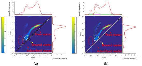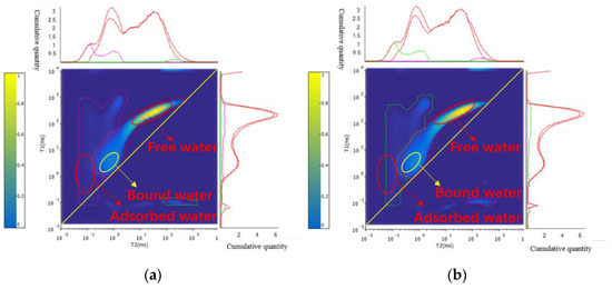 The basis of NMR testing is the interaction between hydrogen atoms and magnetic fields, and the amount of signal reflects the fluid content in the core [33]. During the process of saturated water and water injection displacement in the core, due to the nuclear magnetic moment of the hydrogen nucleus in the water, which undergoes energy level splitting under the action of an external static magnetic field, at this time, a certain frequency of radio frequency field is applied to the rock core, and the nuclear magnetic moment undergoes an absorption transition, resulting in nuclear magnetic resonance. Subsequently, a signal with amplitude decaying over time can be received by removing the RF field. Due to the difficulty in distinguishing adsorbed water, irreducible water, and free water in pores using NMR T2 spectroscopy, this study is based on a combination of two-dimensional nuclear magnetic resonance technology and high-power water injection experiments, using nuclear magnetic resonance two-dimensional spectroscopy to distinguish the distribution of different fluids in pores.
