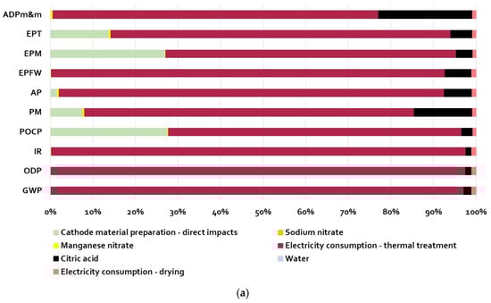 Peters et al. [12] performed one of the first LCA studies on sodium-ion batteries, whereby the authors studied a sodium-ion cell in which the cathodic active material is a layered transition metal oxide (Na1.1Ni0.3Mn0.5Mg0.05Ti0.05O2—NMMT), while the anodic active material is hard carbon, obtained from a carbohydrate (sugar). The cathodic material was prepared with the “solvent casting” method by mixing the active material with a carbon black additive and the polyvinylidene fluoride (PVDF) binder dissolved in N-methyl-2-pyrrolidone (NMP). The anodic material was prepared with the same method by mixing the hard-carbon-based active material with the black-carbon-based additive and the binder, consisting of a mixture of styrene-butadiene copolymer (SBR) and carboxymethylcellulose (CMC) dissolved in water. The current collectors (for both the anode and cathode) were aluminum foils, the electrolyte was sodium hexafluorophosphate salt (NaPF6) dissolved in an organic solvent, and the separator was made of a porous sheet of polyethylene/propylene. Active materials’ manufacturing processes were modeled based on data sheets and patent data, while other cell components and the battery pack were modeled with lithium-ion batteries inventory data, available in the literature. Concerning active materials, production process inputs, in terms of thermal and electrical energy demand, and outputs, in terms pollutants emissions and process waste, were estimated based on stoichiometric considerations or proxy processes. The functional unit was 1 kWh of storage capacity, and the investigated impact categories were the use of fossil resources, climate change, terrestrial acidification, human toxicity, and eutrophication marine and freshwater, assessed through the characterization models implemented by the ReCiPe method [16]. The study showed that cathode and anode preparation processes had significant contributions to all categories examined. In detail, anode production represented 70% of the impact on the eutrophication marine, 30% on climate change and the consumption of fossil resources, and 20% on terrestrial acidification. The cathode was responsible for about 60% of the impact on terrestrial acidification, 20% on climate change, and 16% on terrestrial toxicity.