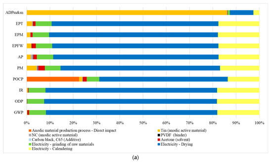 For all considered anode scenarios, the most important process, in terms of resource use, is represented by the active material (in this case, tin); although, in the case of the Sn anode, the solvent also has a not negligible relative weight (approximately 27%). The anodes differ from each other by the binder and solvent used in the production process of the active material.