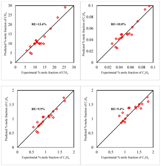 The procedure for estimating kinetic parameters depends on minimizing the mean absolute relative error (MARE) obtained between the experimental and predicted results. The genetic optimization method initially generates a number of chromosomes, with each chromosome representing a different set of kinetic parameters. Each chromosome is evaluated by applying its kinetic parameters in a mathematical model to simulate the response corresponding to sixteen experiments and predict the MARE for each one of these chromosomes. The optimization process continues until the MARE reaches its minimal value, and this chromosome represents the optimum kinetic parameters. The parity plot for the comparison of the experimental data from 16 experiments with the expected findings for CO, CH4, C2H4, C2H6, C3H8, n-C4H10, i-C4H10, C5+, and CO2 is shown in Figure 9. The simulation results at the optimum kinetic parameters are also shown in Table 4. Bench assesses the accuracy of the fitted model by utilizing a quantitative analysis approach and the MARE (11.7%) to compare the acquired results by the fitted model with those estimated by experiments (Table 3), with respect to CO conversion and product selectivity. The good accuracy of the fitted model is in comparison with the values reported by [1] (23.1%); [49] (20%); and [50] (48.4%). The minimum error is recognized for C5+ (MARE = 2.5%), while the maximum error obtained is for remaining CO (MARE = 27.7%). These confirm that the modified model accurately estimates the production rate of liquid biofuels (C5+). The MARE for CO is relatively higher than that for other components because the conversion of CO is high, and the remaining quantities of CO in the reactor effluent are too low. Therefore, higher levels of relative errors occur when comparing the experimental CO concentrations with the predicted CO concentrations in the reactor effluent. The modeling results agree very well with the experimental data, especially in predicting C5+ selectivity.