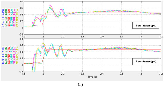 In the case of a 765 kV transmission line failure near the TCSC, as shown in Figure 9, the characteristics of the controller before and after relocation are indicated. Although there is a slight error in the transient state, there is no abnormal operation of control and protection, and the boost factor control and boost-up response characteristics by the SPS (Special Protection Scheme) signal are similar. Moreover, there is no bypass caused by the fault current in the case of the 765 kV fault.