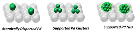 With regard to catalysis, it is commonly assumed that Pd NPs or clusters supported on oxides are the active components for several types of catalytic reactions [4,5,6]. However, there is increasing evidence that single atoms, or very small clusters, can offer district advances in catalytic efficiency, especially in the case of the supported metal [7] see Figure 1. In these cases, the interfacing of the Pd-atoms with the support metal oxide can easily supply oxygen atoms [8]. Single atoms, on the same support, can have different coordination environments that will translate into different electronic and catalytic behaviours.