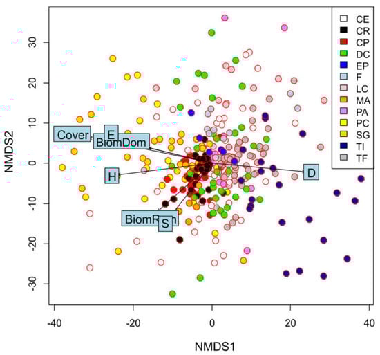 In Figure 4 (NMDS with passively projected bioindicator values), it is possible to detect which of the recorded plant species are mostly related to bioindicator values (Figure 4). The distribution of the plant species illustrates which species are related to the increasing value of the diversity of indexes of the vegetation type associations.