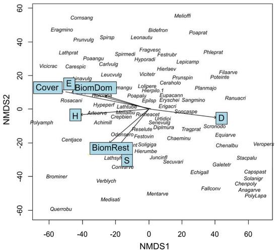 The biplot of NMDS with passive projection of explanatory variables (all are significant, p < 0.05) based on species occurrence of the recorded vegetation growing on coal mine heaps. The first four letters of names denote genus names and next four denote species names. Abbreviation explanation: Shannon-Wiener-H’; Evenness -E; species richness -S; Simson dominance index -D.