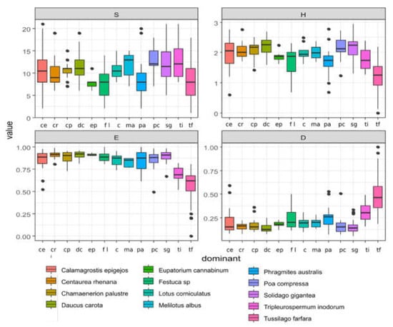 The comparison of the value of the diversity H’, E, D, and species richness (S) indexes calculated for the distinguished plant community vegetation types were performed. In terms of the species richness, the Eupatorium cannabinum and Festuca G\group and Tussilago farfara vegetation type are significantly different from Poa compressa and also partially different from Solidago gigantea and Tripleurospermum inodorum. The value of the H’ diversity index of Daucus carota was significantly different from those of the Festuca group, Phragmites australis, and Tripleurospermum inodorum. The value of the H’ diversity index of the Tussilago farfara vegetation type was significantly lower. The values of the E diversity indexes of the Centaurea rhenana and Daucus carota groups were significantly different from those of Melilotus albus. The values of the E diversity indexes of Tussilago farfara and the Tripleurospermum inodorum vegetation types were significantly lower. In terms of the Simson dominance index (D), the Daucus carota vegetation type was significantly lower. The Calamagrostis epigejos, Centaurea rhenana, Chamaenerion palustre, Eupatorium cannabinum, Lotus corniculatus, Melilotus albus, and Poa compressa groups were similar in terms of the D index (Figure 11 and Table 2).