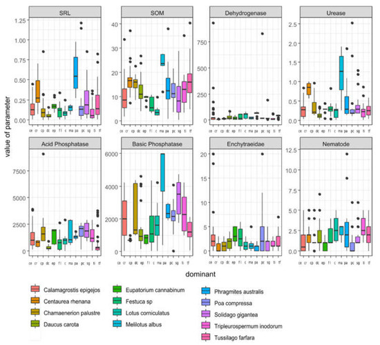 The analysis of soil organic matter (SOM) content revealed the highest levels in vegetation types dominated by Daucus carota, Lotus corniculatus, and Melilotus albus. Conversely, the lowest SOM content was observed in the Calamagrostis epigejos and Poa compressa vegetation types. Importantly, the differences in SOM content among these vegetation types were found to be statistically significant. However, no significant difference in SOM content was observed between Calamagrostis epigejos and Poa compressa vegetation types. Regarding acid phosphatase activity (AP), the highest levels were recorded in the Solidago gigantea vegetation type, while the lowest AP activity was observed in the Daucus carota and Tussilago farfara vegetation types. These differences in AP activity were found to be statistically significant. Basic phosphatase activity (BP) was found to be highest in the Solidago gigantea vegetation type and lowest in the Centaurea rhenana vegetation type. Statistical analysis confirmed the significant differences in BP activity between these two vegetation types. Dehydrogenase activity (DH) was notably higher in Lotus corniculatus, while the Phragmites australis vegetation type exhibited the lowest DH activity. Statistically significant differences in DH activity were observed between Phragmites australis and Centaurea rhenana, as well as the Tripleurospermum inodorum vegetation type. Urease activity (UR) was significantly higher in Melilotus albus, compared to the Daucus carota vegetation type, which displayed the lowest UR activity. Additionally, the Melilotus albus and Centaurea rhenana vegetation types exhibited significant differences in UR activity when compared to the Daucus carota vegetation type. Specific root length (SRL) was found to be significantly different in the Phragmites australis vegetation type when compared to the Chamaenerion palustre, Festuca, and Daucus carota vegetation types. The Daucus carota, Melilotus albus, and Tussilago farfara vegetation types displayed significant differences in nematode (N) populations compared to other vegetation types. Nevertheless, the biomass of the dominant plant species compared to the rest of the species that were not the dominant in the patches of the particular vegetation types was revealing, with outstanding values for Melilotus albus and Lotus corniculatus vegetation types. The highest fauna (Nematode and Enchytraeidae) presence was found in Euaptarium cannabinum, Festuca sp. Group, and Calamagrostis epigejos, and also in the Poa compressa and Melilotus albus vegetation types. In turn, the highest nematode presence was observed in Tripleurospermum inodorum, Melilotus alba, and Lotus corniculatus, as well as in Phragmites australis.