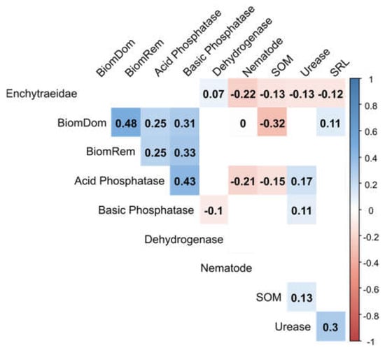 The Spearman correlation matrix of the biomass of dominant and remaining species and biotic data including SOM, soil enzymes, SRL Nematodes and Enchytraeidae.