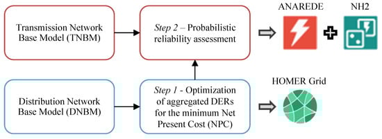 The probabilistic reliability assessment with the NH2 simulation tool, based on the state enumeration method, makes use of the power flow to assess the adequacy of the system’s contingency states at a given load scenario and the OPF for the application of corrective measures [].