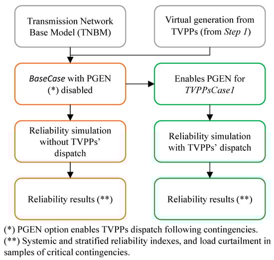 Step 2 of the methodology consists of the probabilistic reliability assessment [] of the TS considering the possibility of dispatching active power from the TVPPs (virtual generations) as corrective measures following transmission contingencies by the OPF of the NH2 reliability model [,].