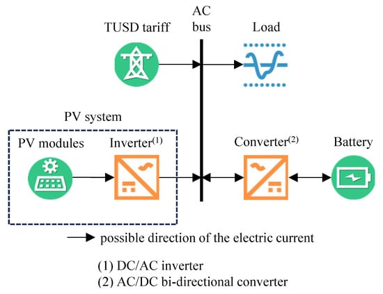 The battery was connected to the AC bus through an AC/DC bi-directional converter for both rectification and inversion []. Battery charging was carried out via the PV system or the grid.