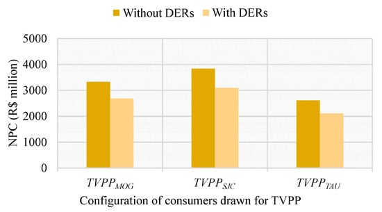 It was assumed that the consumers drawn for the TVPPs could enter the ACL to establish a Power Purchase Agreement (PPA). A flat energy consumption cost from the grid was considered equal to the average difference settlement price (PLD) for the period from January 2014 to April 2019, which was equal to R$ 326.25/MWh [] with additional tax rates as estimated for the distribution system use tariff (TUSD) [].