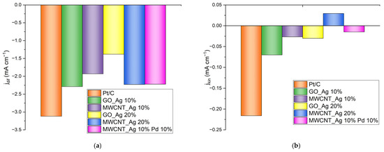 The values of current density in the kinetic region for the obtained catalysts differ greatly from the values of this attribute for the commercial platinum catalyst (Pt/C), which indicates their lower catalytic activity. The GO-based catalyst containing 10% wt.% silver exhibits high activity and shows high current density values among all synthesized catalysts.