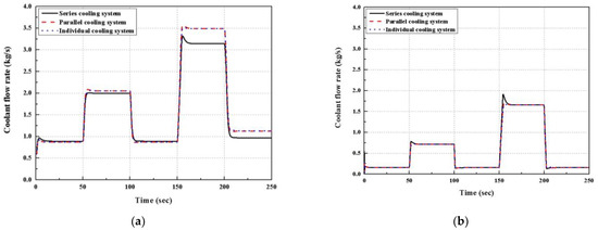 Since the series cooling system is able to flow more coolant to the second stack, the total coolant flow rate from the pump is lower than the individual cooling system or the parallel cooling system. Figure 8a shows the coolant flow rate discharged from the pump and the total coolant flow rate to the dual stack. Figure 8b,c give the coolant flow rate supplied to stack module 1 and 2, respectively. As expected, the coolant flow rate to the first stacks of the three different cooling configurations has the same value except for the second peak. At the second peak, the series cooling shows more overshoot, which depends on the tuning gain of the feedback control. Except for that, the profile of the coolant flow agrees well across the various cooling systems. On the other hand, the series cooling is able to flow more coolant to the second stack, which is shown in Figure 8c. By increasing the coolant flow rate into the second stack, the temperature control of the second stack is obtained with a narrow temperature difference between the coolant inlet and the exit temperature.