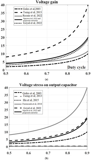 Generally, the generated voltage of these sources is limited, and these low-voltage RESs are equipped with DC–DC converters before connecting to the power grid. The gain of DC–DC boost converters is theoretically infinite when the duty cycle is equal to one, but in practice, as the duty cycle increases, the voltage gain and efficiency of the converter decrease sharply. The reason for this is that through longer duty ratios, the dynamic losses due to the high number of current peaks in the components increase, and the voltage stress across the switch and diode which is equal to the output voltage of the converter in a conventional boost converter increases. Since an internal resistor is modeled for the switch and diode, larger currents lead to more power losses across these resistors with larger voltage drop values.