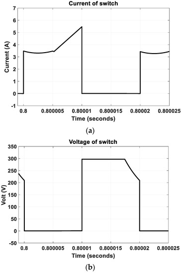 . These figures show that for the time intervals that the switch is activated, a voltage equal to zero drops across the drain-source pins, and for the time durations that the switch is deactivated, the current reaches zero amperes, and the voltage close to the voltage of capacitors