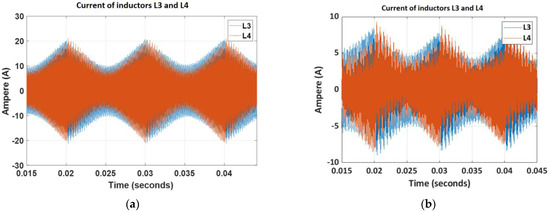 Figure 19a. This figure shows that for the power values between 200 and 400 W, a maximum value of 20 A and a minimum value of 10 A is established through these inductors. Currents with fewer amplitudes can be obtained by the application of larger inductors.